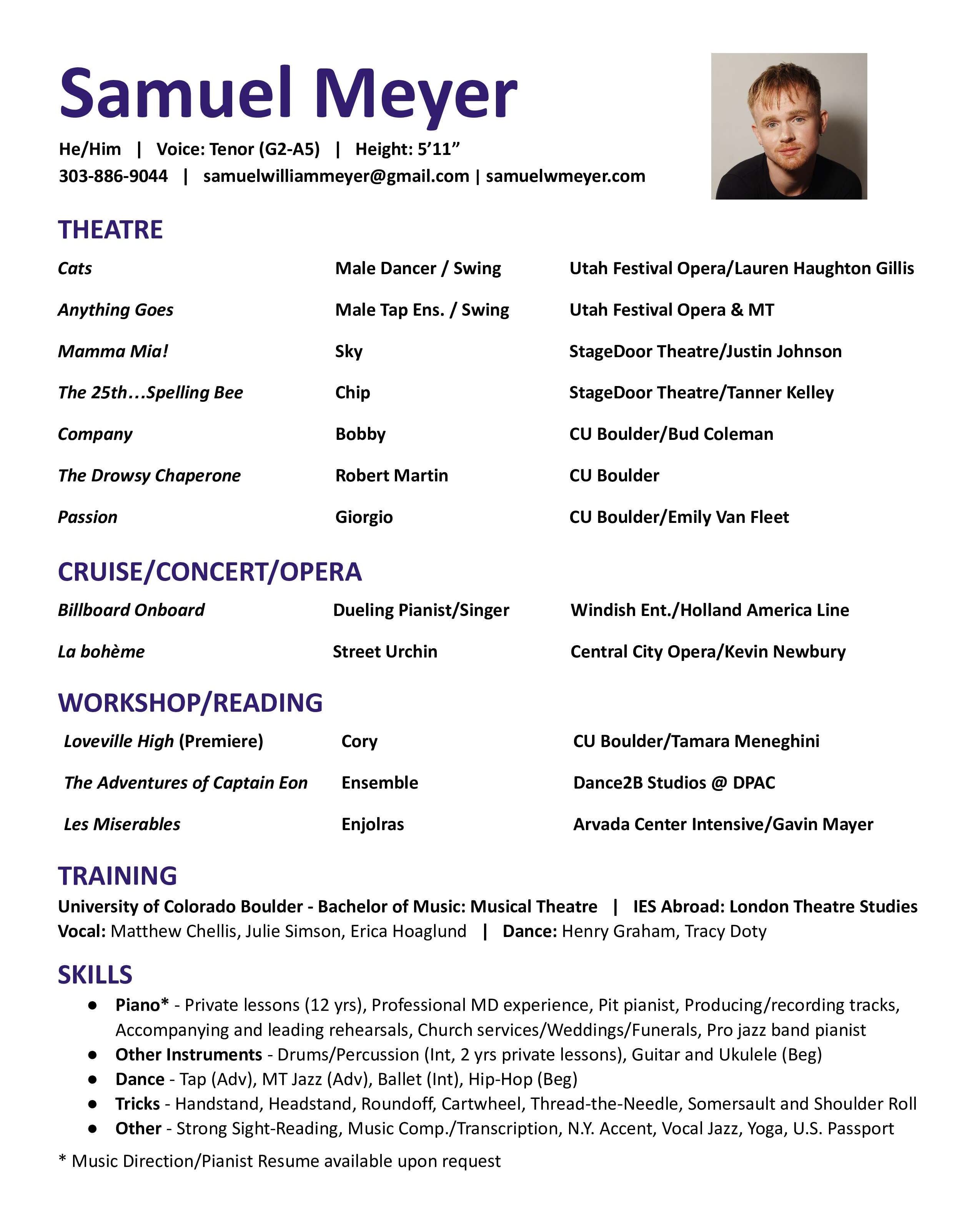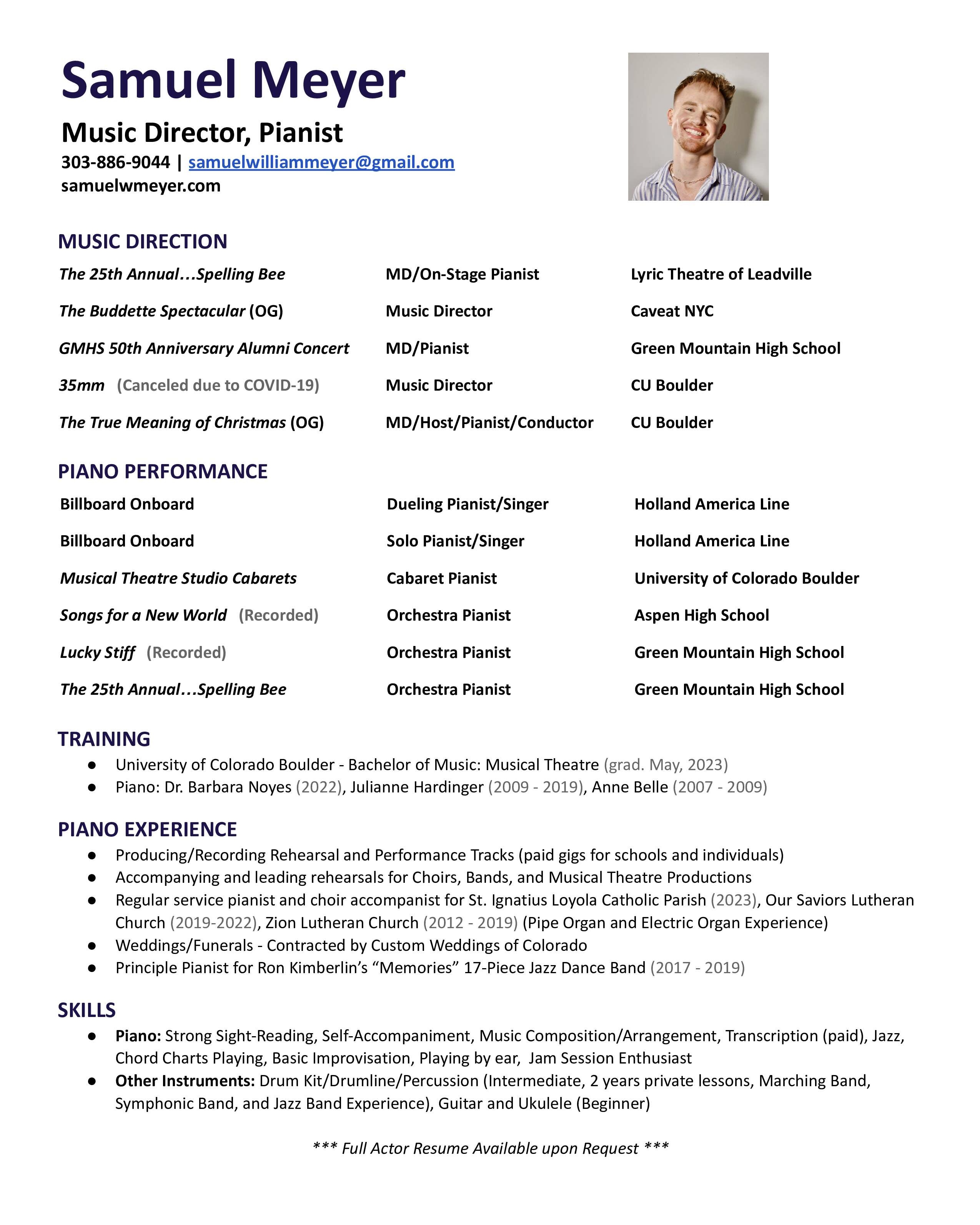 Some of my favorite experiences have been in Colorado's rich regional theatre scene, including at the Arvada Center for Arts and Humanities (Summer Intensive productions of “Les Miserables” - Enjolras, and “Pippin” - Pippin), and at StageDoor Theatre in beautiful Conifer, Colorado, playing Chip in “The 25th...Spelling Bee” and Sky in "Mamma Mia!". Additionally, I recently gained my first professional music directing credit at the iconic and historic Tabor Opera House in Leadville, Colorado, where I was M.D. for The Lyric Theatre of Leadville's "The 25th...Spelling Bee".